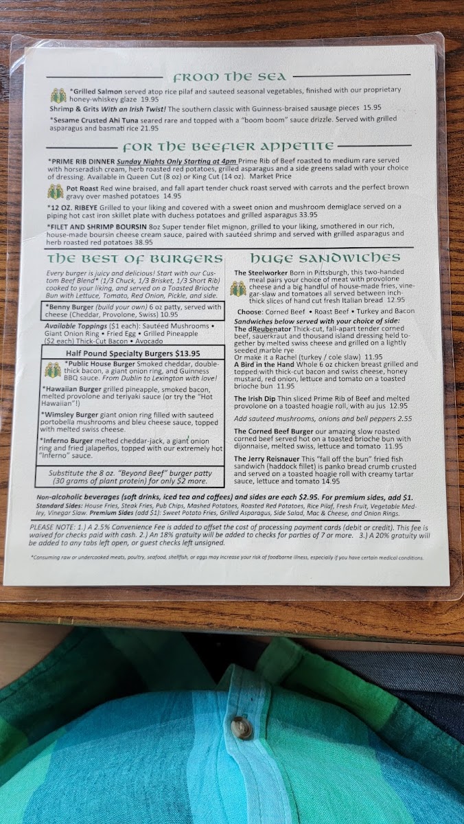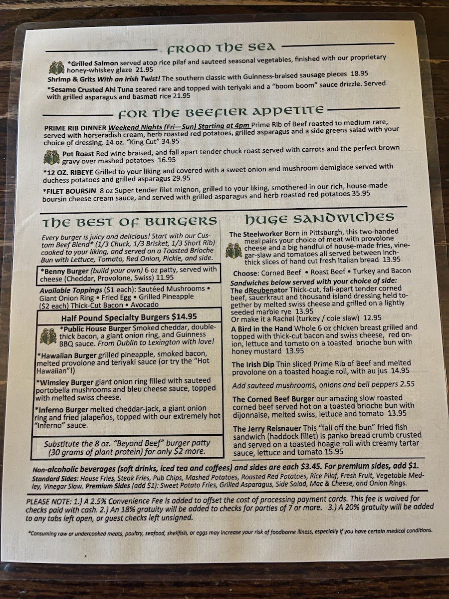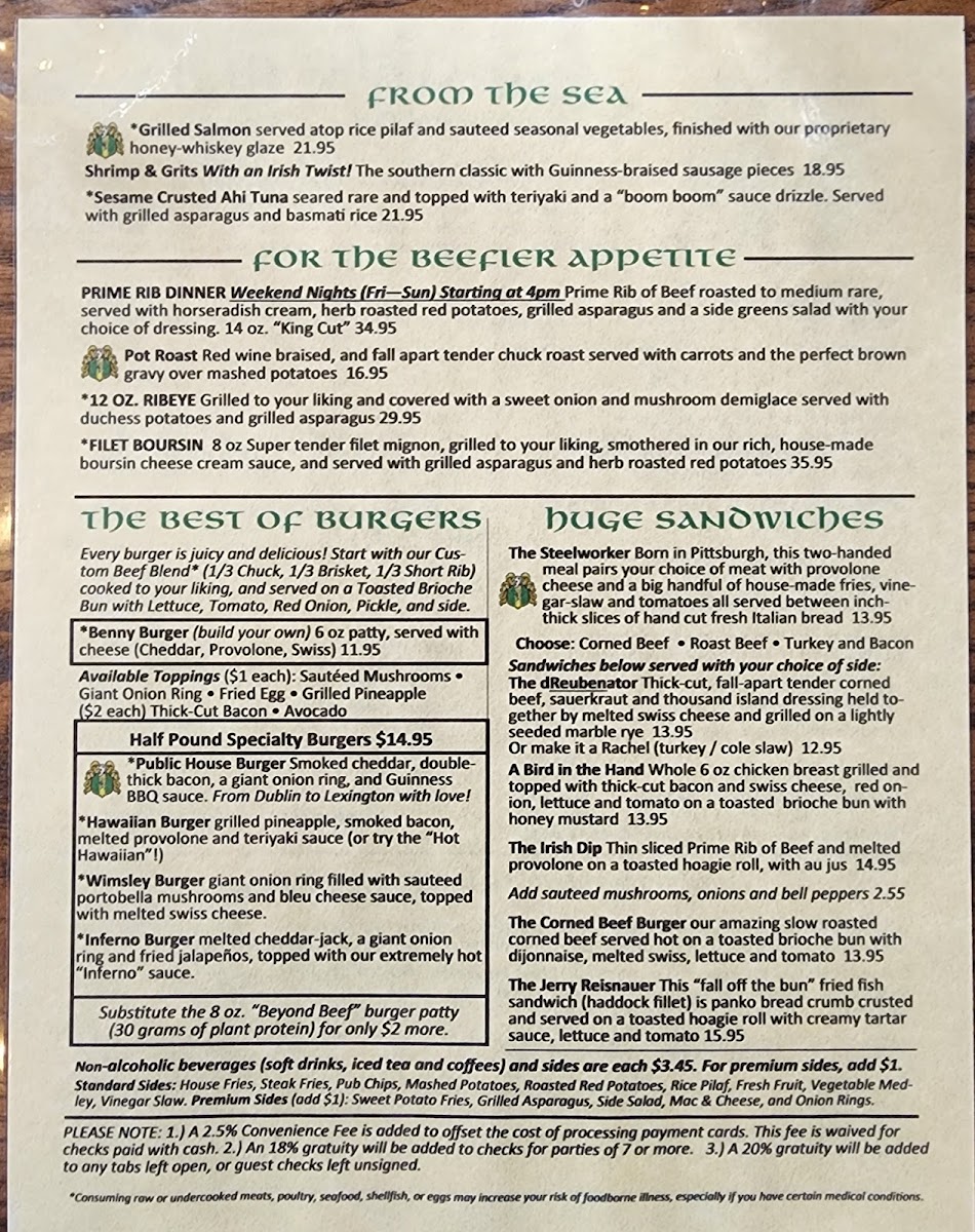 12oz. prime rib of beef roasted to medium rare served with horseradish cream, herb roasted red potatoes, grilled asparagus and a side salad.
